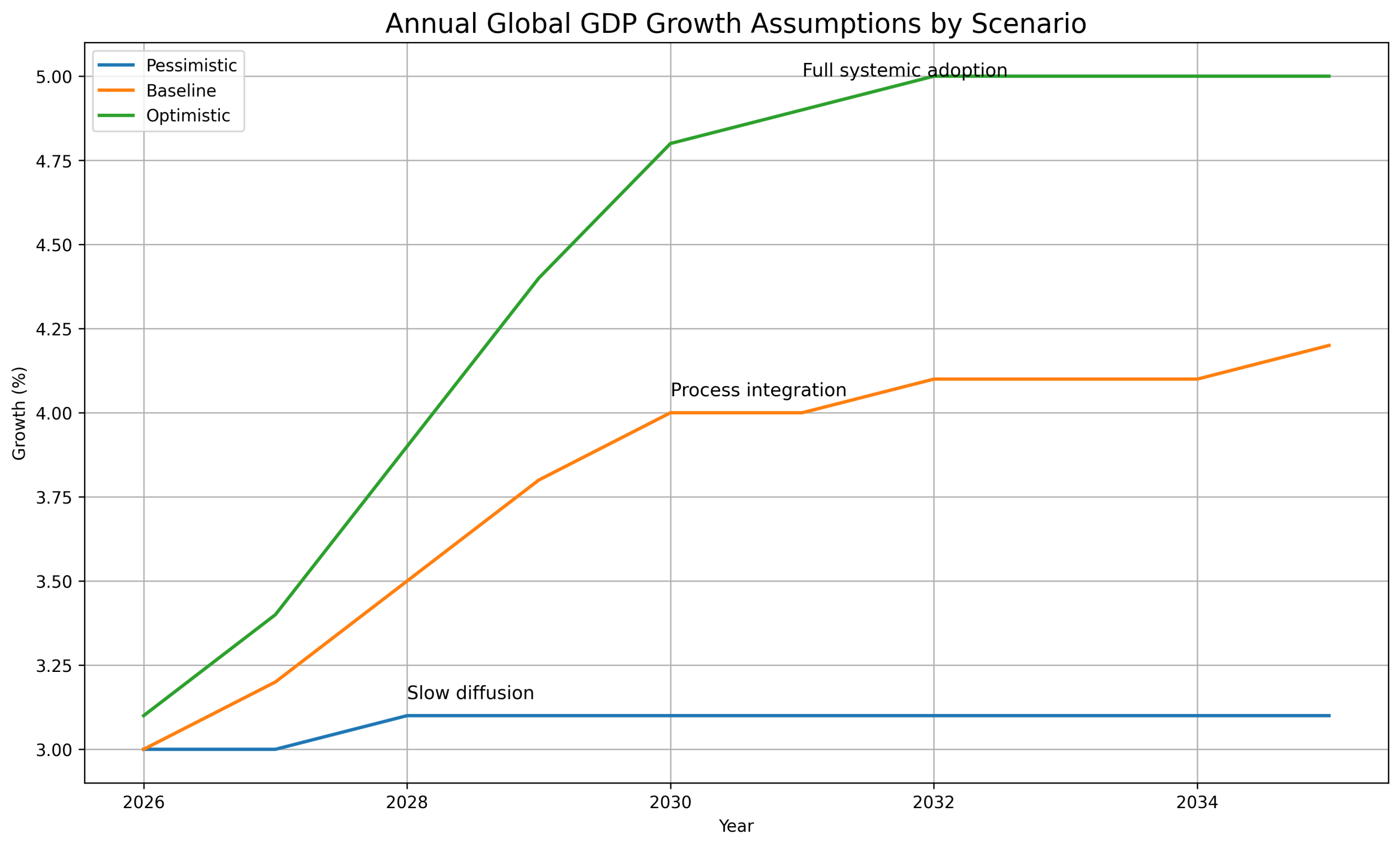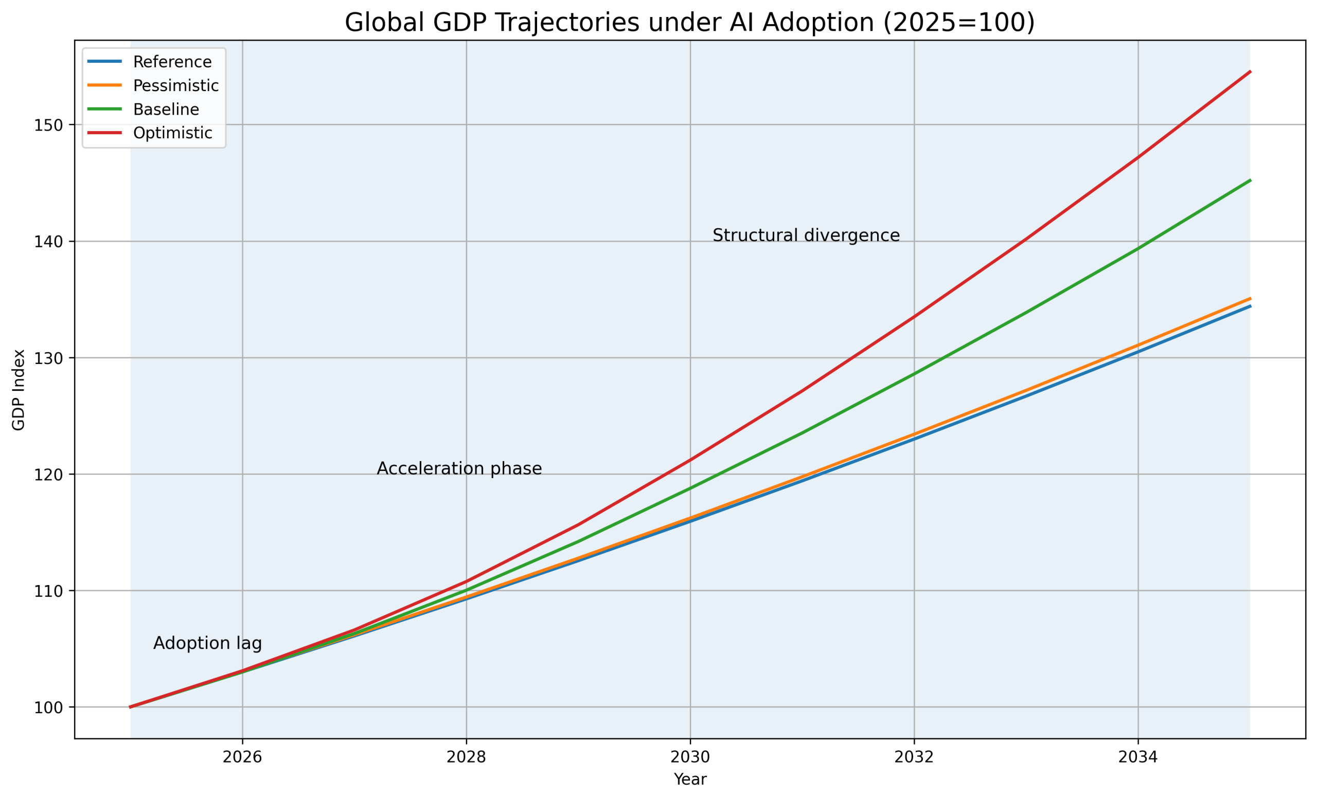 Figure 1. Global GDP Scenario Trajectories under AI Adoption (2025–2035)
