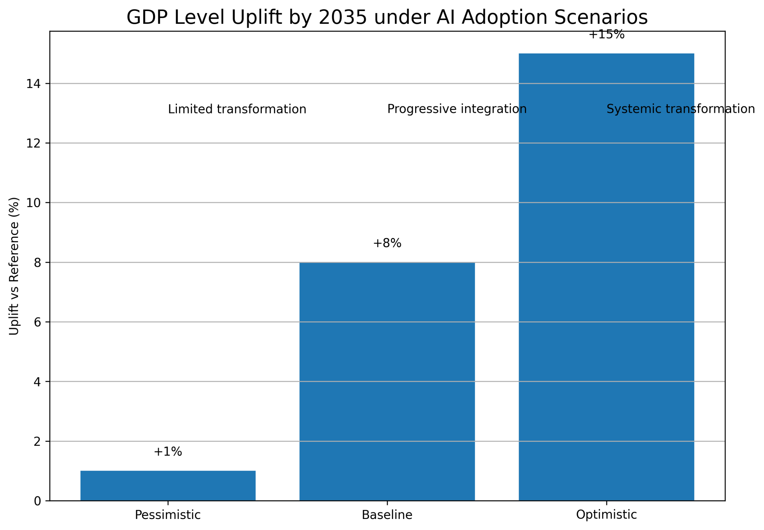 Over the decade, these small differences compound. In a baseline scenario, the progressive integration of AI into organizational processes leads to a moderate but sustained acceleration of growth. As shown in Figure 1, this trajectory departs from the reference path through incremental gains that accumulate rather than through abrupt discontinuities.