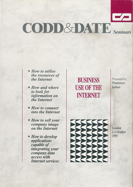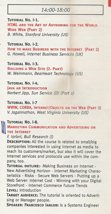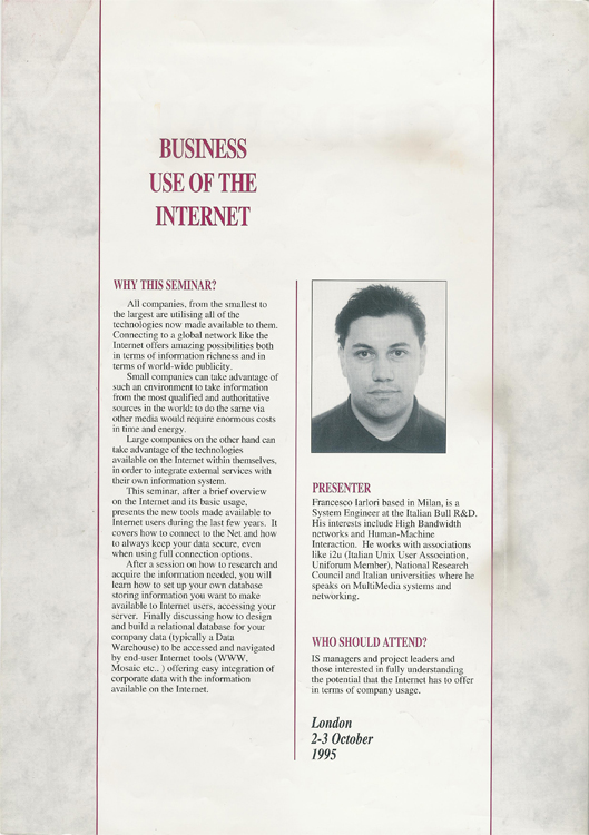 My website has been online since 1994. Initially, it used his proper NCSA http server port over Bull Open System and later Linux Slackware. Since then I’ve travelled the world explaining this media’s possibilities to both the general public and executives. One of my first presentations was in London, UK, in 1995 and here’s the brochure:
