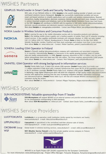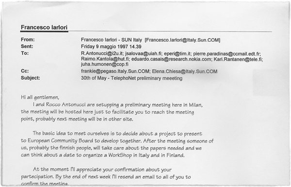During a conversiona in Genoa University I realized to impement something new, something closer to human using the cooperation of market leader in term of smart card, devices, and universities (nordic for the design), where also an advacend Telecom Operator, was present. I had in charge to cover the business and technology part of the project and Rocco Antonucci the academic part of it. Here there is the email I sent in May 1997 as a Sun Employee. And here the text. The project after two meeting I organized, was followed by my colleagues in Sun France, and the original Italian Telco operator, TIM, was replaced by Omnitel. From code name TelephoNet the project did change in Wishes. The project brochure is here front and rear.
